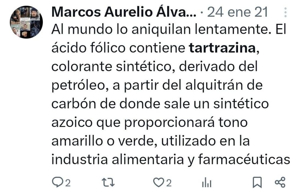 Descubrí que la tartrazina está presente en muchos medicamentos, suplementos vitamínicos y productos dirigidos a mujeres embarazadas, como el ácido fólico. Diversos estudios alertan sobre su impacto en el sistema neurológico y conductual. Al conversar con médicos internistas, supe que el ácido fólico debería administrarse durante la gestación en dosis mínimas (0.4 a 0.8 mg), y no en unidades de gramos como algunas fórmulas comerciales lo hacen. La combinación de una dosis elevada con tartrazina podría ser un detonante de alteraciones en el neurodesarrollo fetal.
