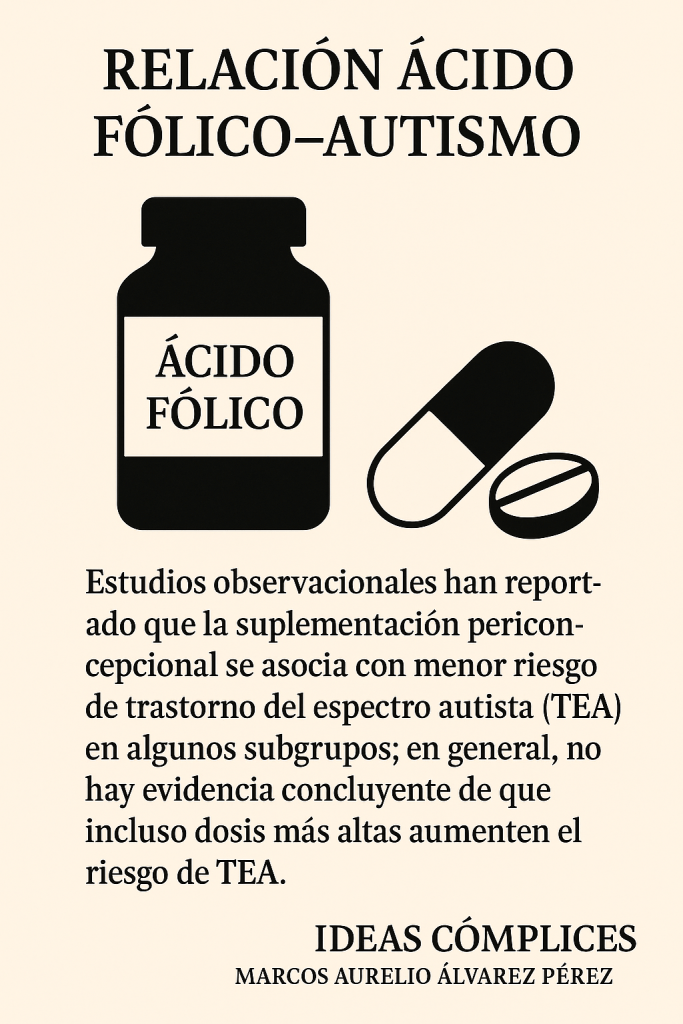 2. Relación ácido fólico–autismo. Estudios observacionales han reportado que la suplementación periconcepcional se asocia con menor riesgo de trastorno del espectro autista (TEA) en algunos subgrupos; en general, no hay evidencia concluyente de que incluso dosis más altas aumenten el riesgo de TEA.