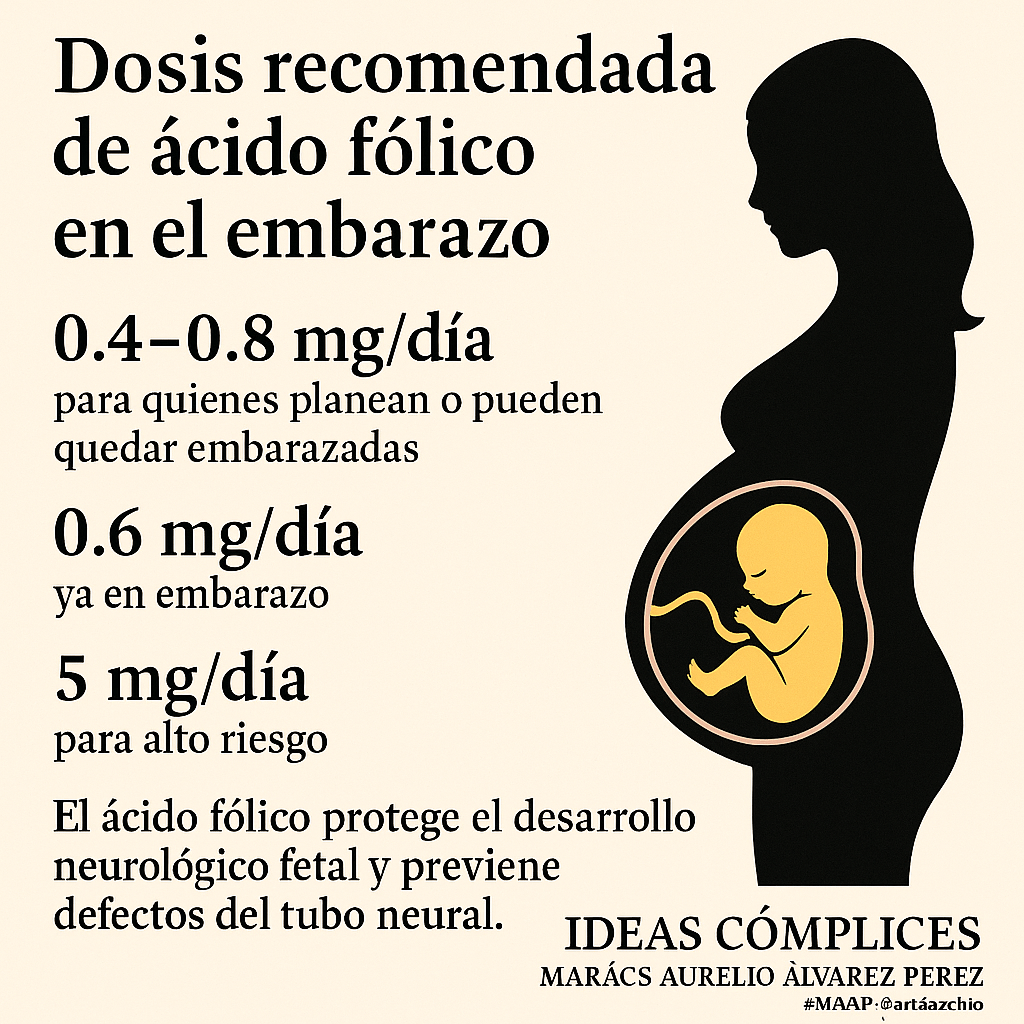 1. Dosis recomendada de ácido fólico en embarazo. Las guías clínicas recomiendan 0.4–0.8 mg/día para quienes planean o pueden quedar embarazadas; 0.6 mg/día ya en embarazo. Dosis de 5 mg se reservan para altísimo riesgo (antecedente de defectos del tubo neural, ciertos fármacos, etc.).